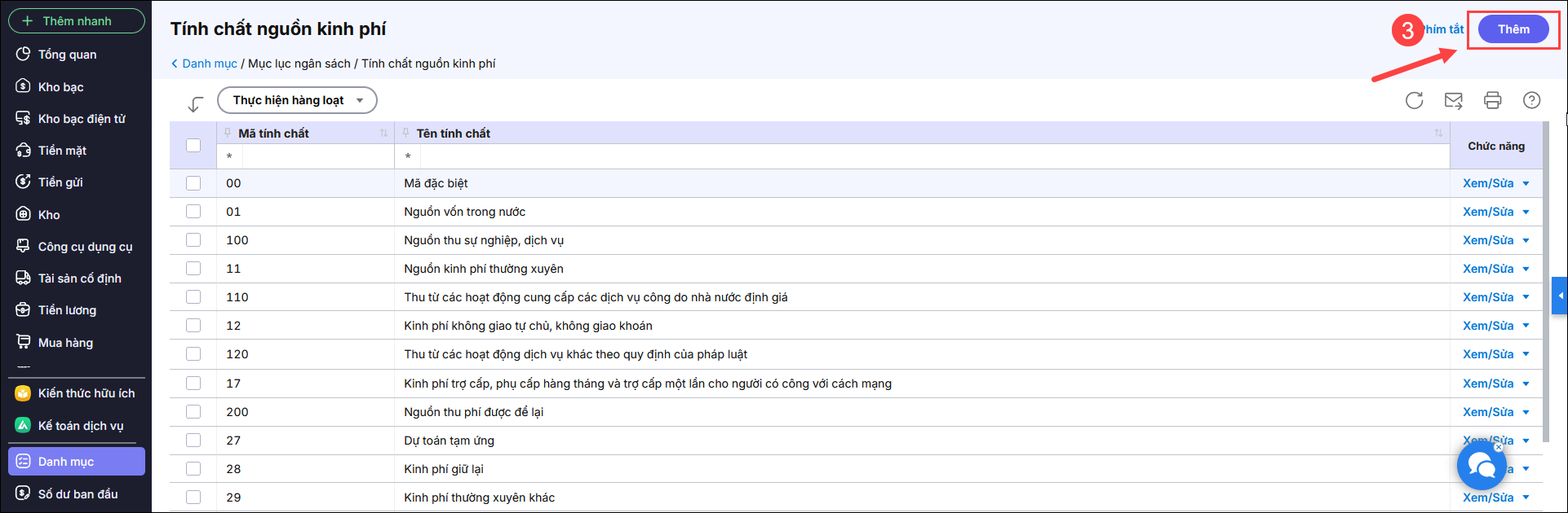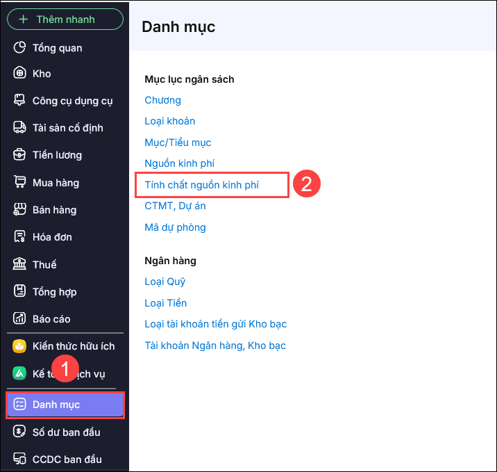 Bước 1: Vào Danh mục\Tính chất nguồn kinh phí.