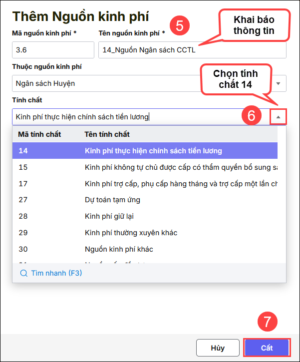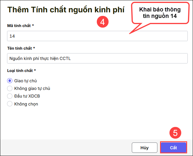 Bước 3: Khai báo thông tin tại cửa sổ thêm tính chất nguồn kinh phí. Khai báo mã tính chất: 14, Tên tính chất: KP thực hiện cải cách tiền lương, tích chọn Giao tự chủ hoặc Không giao tự chủ ⇒ Nhấn Cất.