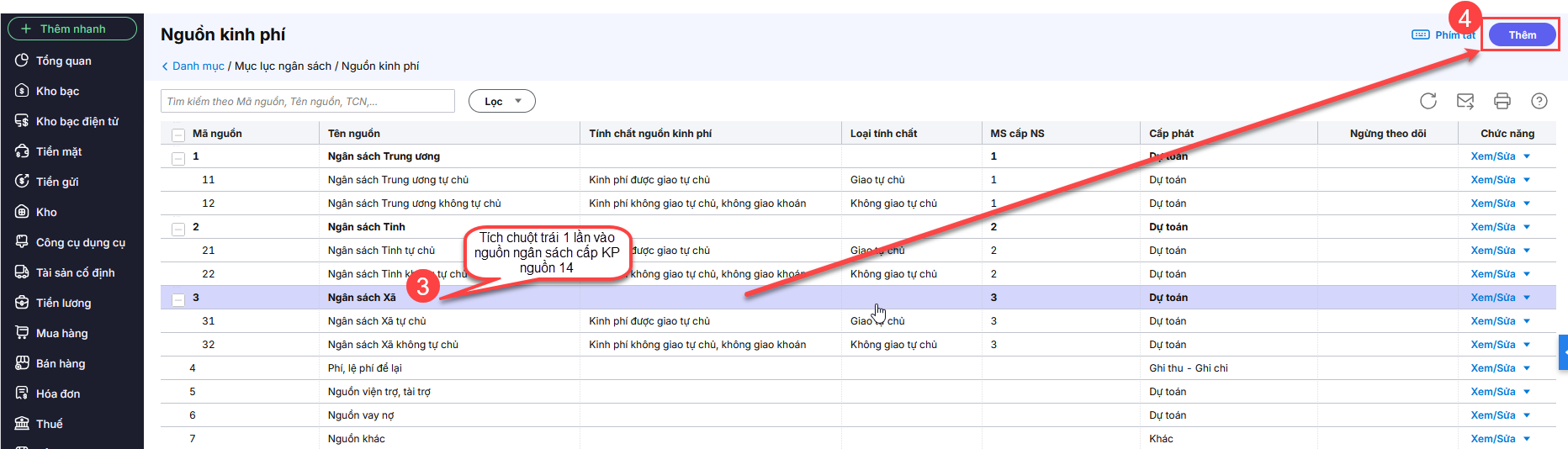 Bước 2: Căn cứ vào Nguồn cải cách tiền lương (14) sử dụng thuộc nguồn ngân sách Trung ương, Tỉnh, Xã ⇒ nhấn chuột vào nguồn cha tương ứng , tích Thêm. VD: Muốn thêm nguồn (14) thuộc nguồn ngân sách Xã, anh/chị tích chuột 1 lần vào nguồn ngân sách Xã sau đó nhấn Thêm