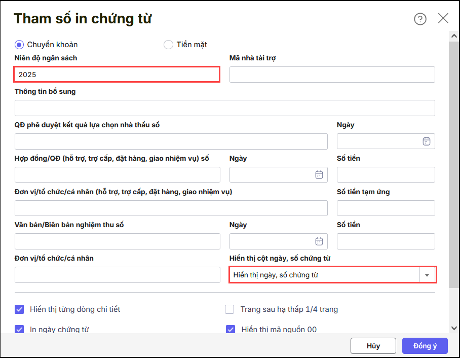 Nhập niên độ ngân sách (năm ngân sách) tương ứng cần hiển thị vào ô Niên độ ngân sách như Nhập 2025, 2026, 00,…. hoặc để trống nếu không muốn hiển thị.
