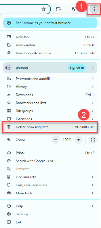 Chọn ?️ Delete browsing web… (Clear browsing data…).