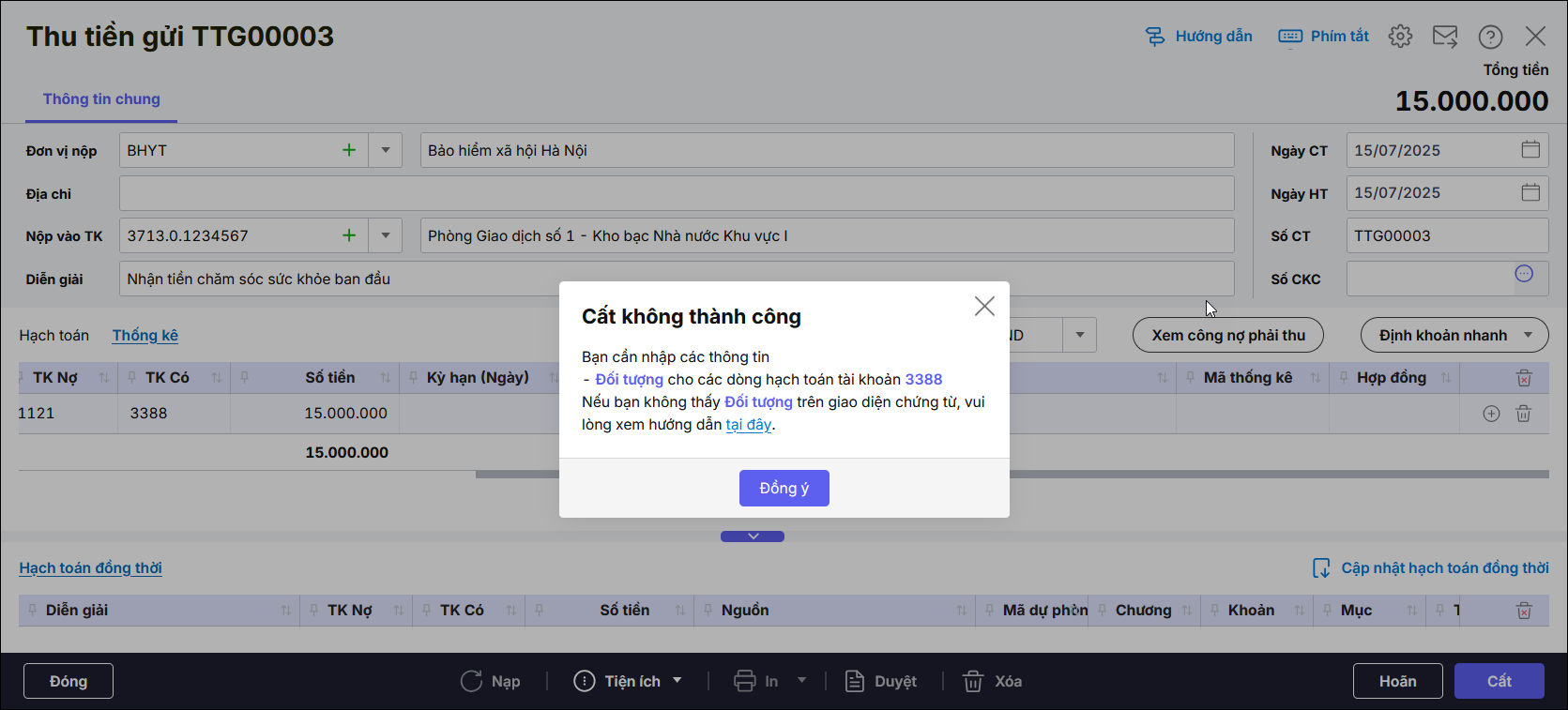 Khi lập chứng từ anh/chị cất thì phần mềm hiển thị cảnh báo Cất không thành công nội dung chi tiết liên quan đến Đối tượng thì thực hiện như sau: