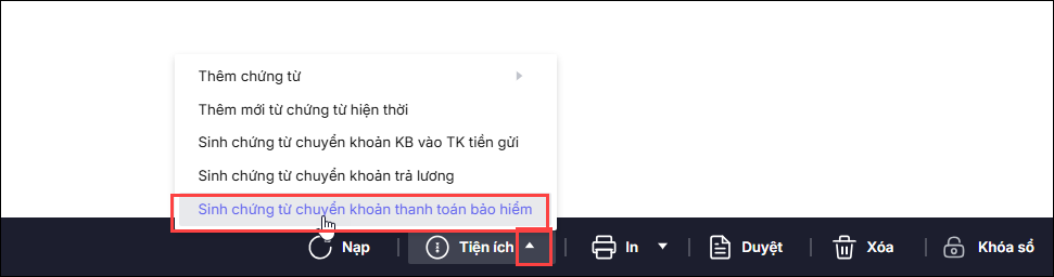 Trên giấy rút chuyển khoản lương, bảo hiểm vào Tiện ích \Sinh chứng từ chuyển khoản thanh toán bảo hiểm.