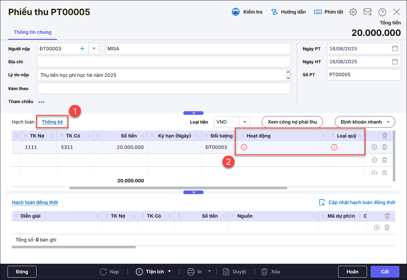 • Trên chứng từ Phiếu thu, nhấn Sửa, chọn qua tab Thống kê, chọn Loại quỹHoạt động tương ứng rồi Cất.