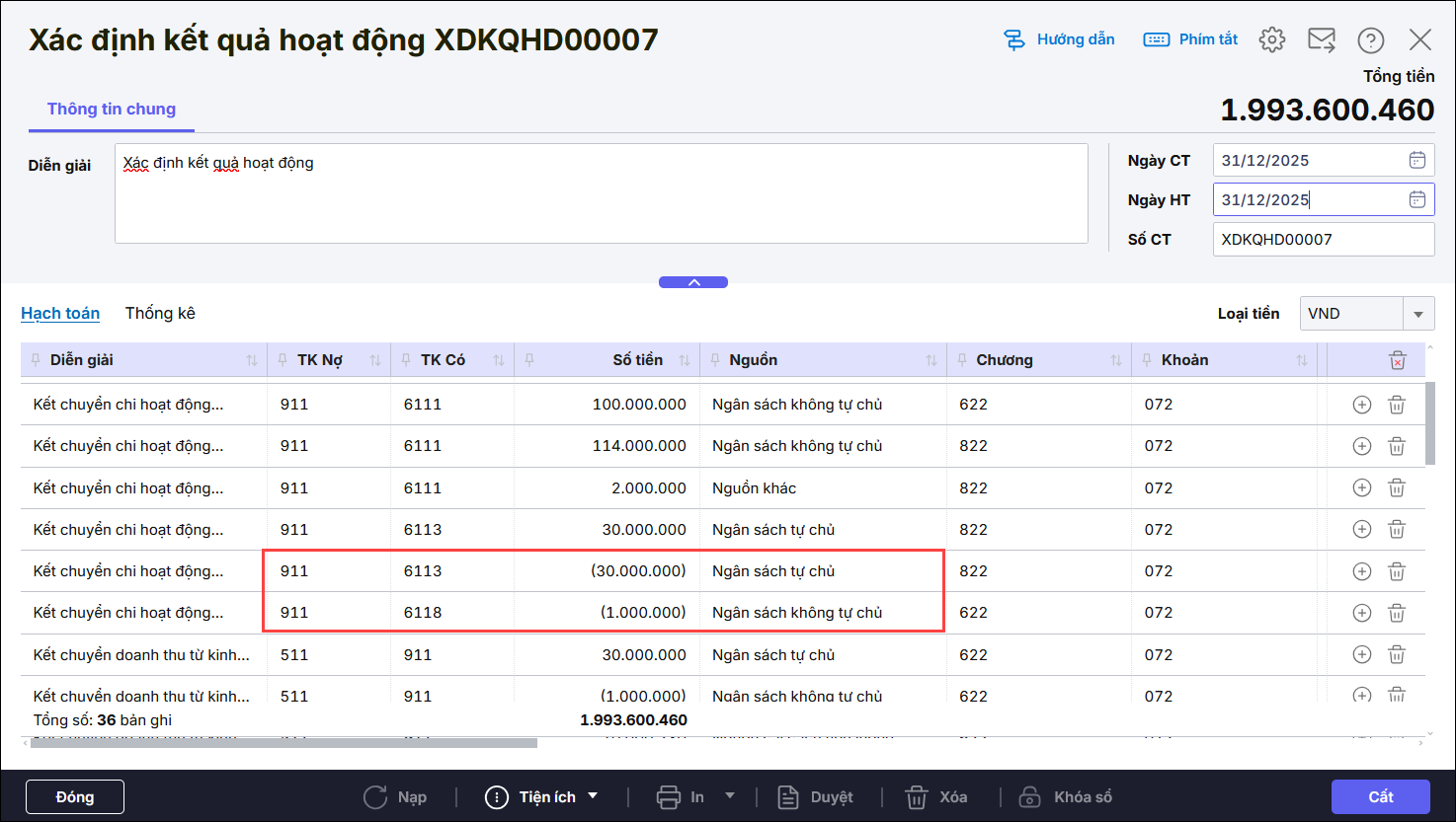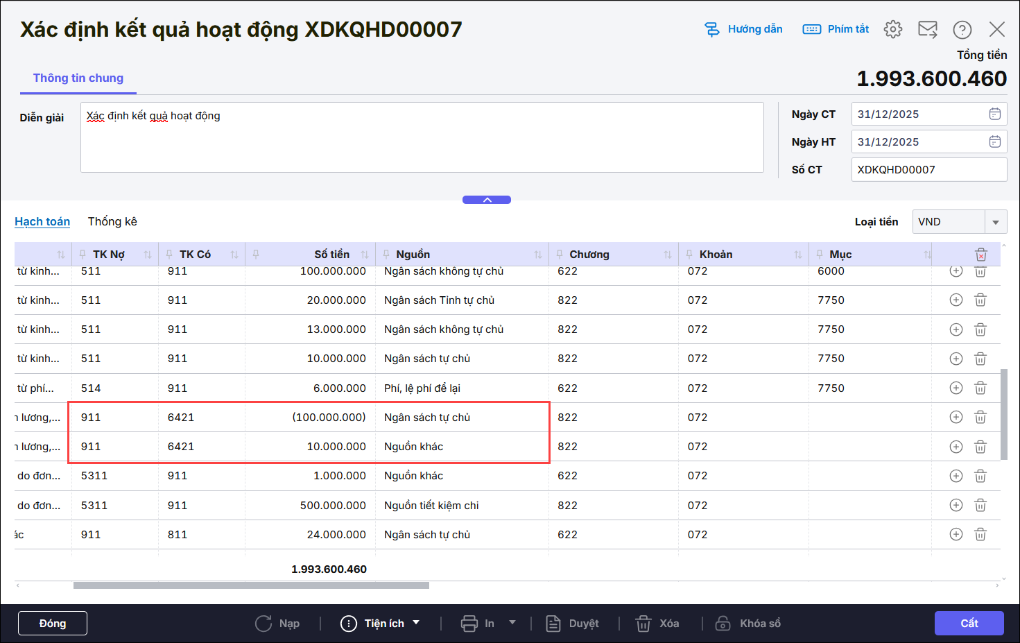 Khi làm xác định kết quả hoạt động các tài khoản kết chuyển từ tài khoản đầu 5 tới đầu 9 được tích chi tiết theo cái gì trong Danh mục\Hệ thống tài khoản thì kết chuyển sẽ kết chuyển chi tiết tới cái đó. Chứng từ xác định kết quả hoạt động có dòng âm thường do 2 nguyên nhân: