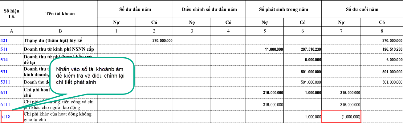 - Kiểm tra các tài khoản kết chuyển từ đầu 5 tới đầu 9 xem có dư âm không, nếu có thì nhấn vào số tài khoản bị âm và kiểm tra lại và điều chỉnh cho đúng, thông thường bị âm thường do nghiệp vụ điều chỉnh ( Ví dụ chứng từ phát sinh hạch toán Nợ 6111/ Có TK 511, nhưng khi điều chỉnh kinh phí lại hạch toán Nợ TK 6118/ Có TK 511 –> Cần sửa lại chi ở tài khoản nào thì khi điều chỉnh hoặc nộp trả phải chọn đúng tài khoản đó)
