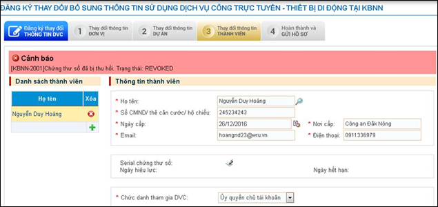 4. Làm thế nào khi đăng ký thay đổi/bổ sung thông tin gặp lỗi: “Chứng thư số đã bị thu hồi. Trạng thái Revoked”?