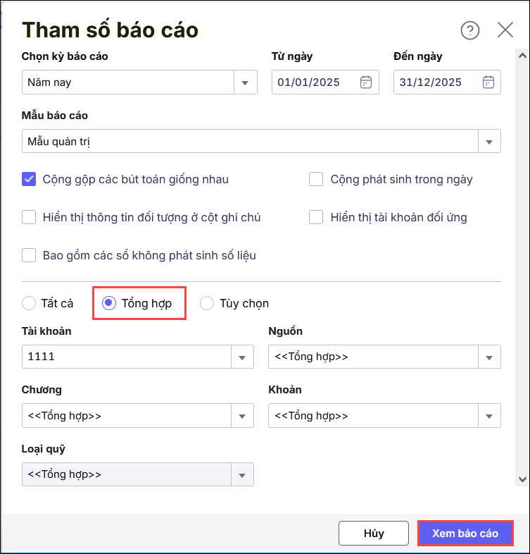 Do tài khoản 111x không chi tiết theo Nguồn/Loại khoản, trong khi in báo cáo thì đang chọn các thông tin Nguồn/Loại khoản.