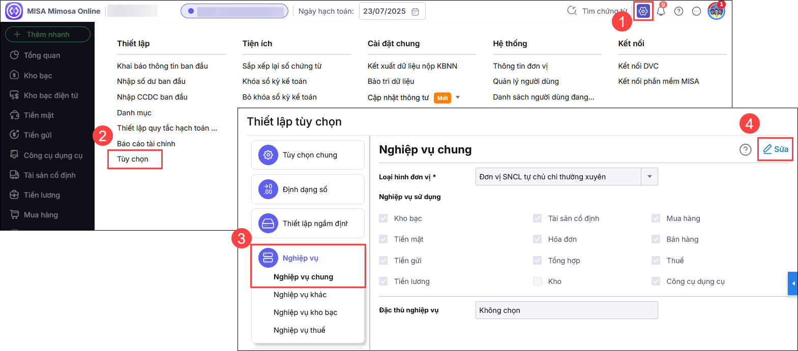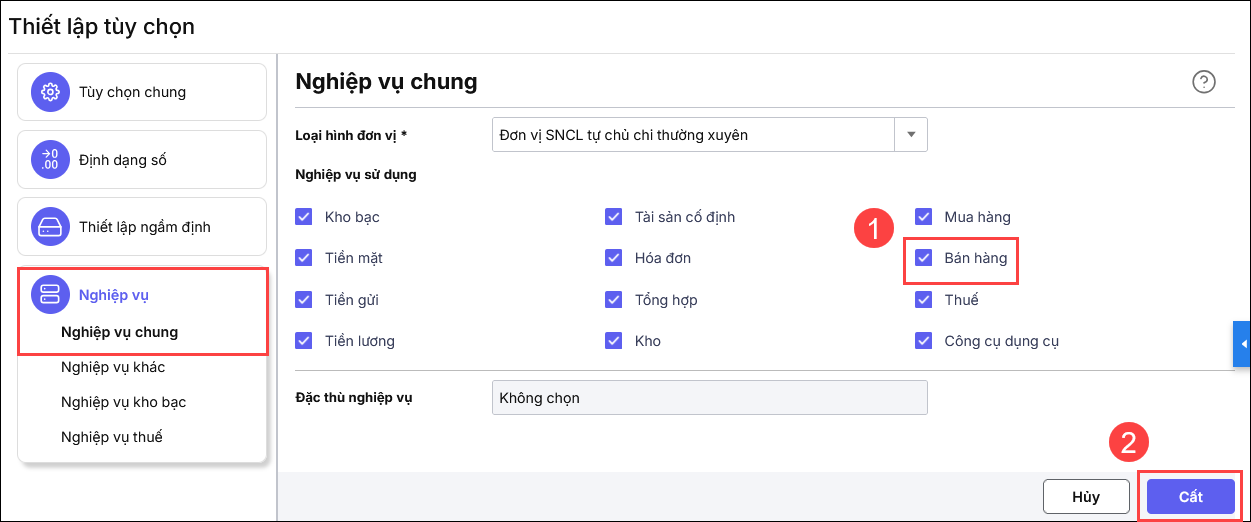 Bước 1: Vào biểu tượng bánh răng ⚙ ( góc phải bên trên )Thiết lập\Tùy chọn, nhấn Nghiệp vụ\Nghiệp vụ chung