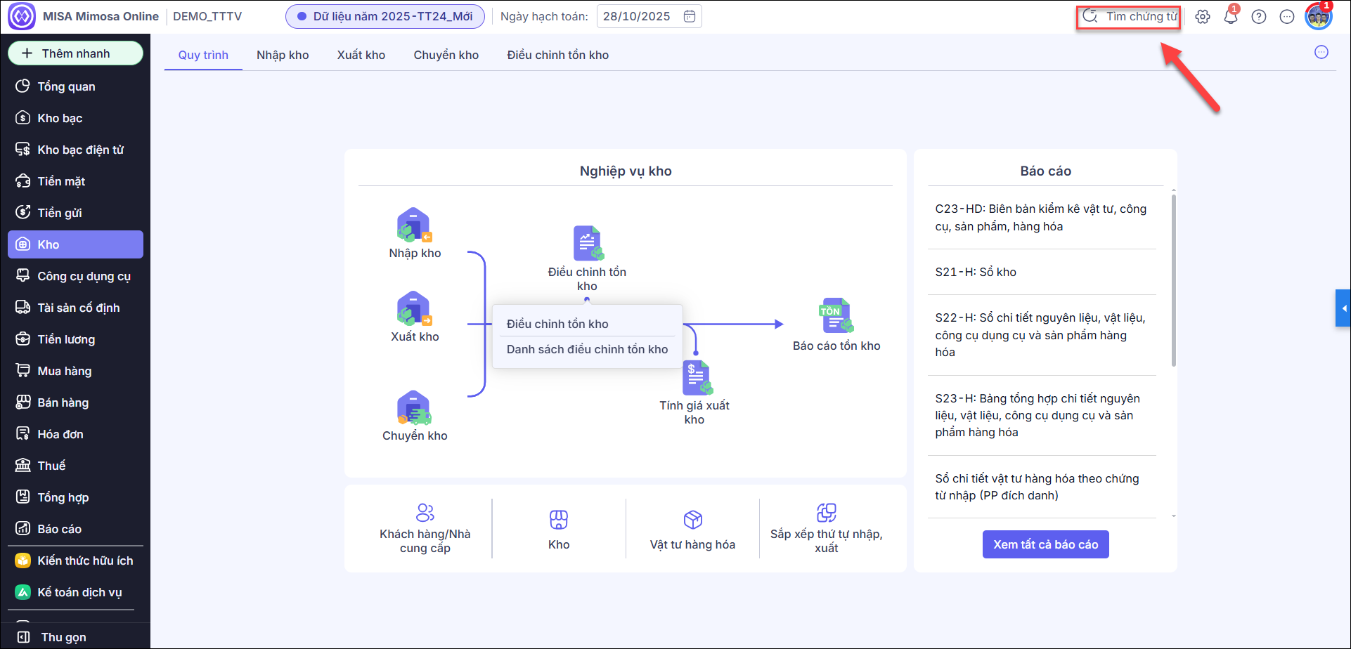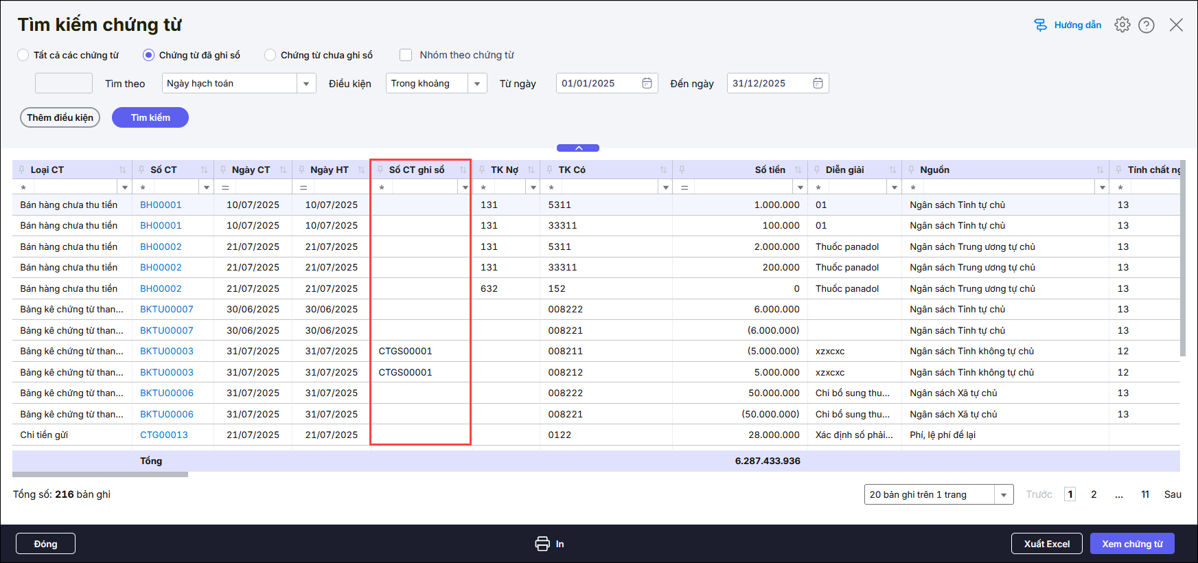 Cách 2: Kiểm tra trong phần tìm kiếm chứng từ để biết chứng từ đó được lập ở chứng từ ghi sổ nào.