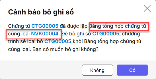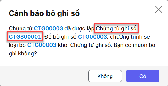 2.1 Nguyên nhân 1: Chứng từ đã được lập ở chứng từ ghi sổ khácGiải pháp 1: Anh/chị kiểm tra chứng từ đã được lập ở chứng từ ghi sổ nào rồi kiểm tra sửa lại theo các bước sau: Bước 1: Xác định chứng từ đã được lập ở chứng từ ghi sổ nào bằng một trong hai cách: Cách 1: Anh/chị Nhấn Bỏ ghi chứng từ đang không tìm thấy đó phần mềm sẽ cảnh báo chứng từ đó được lập ở chứng từ ghi sổ nào.