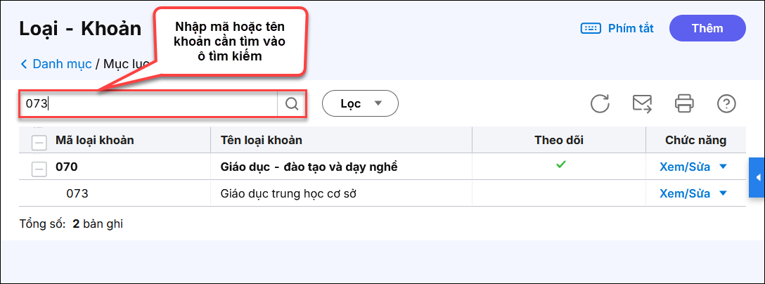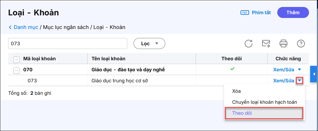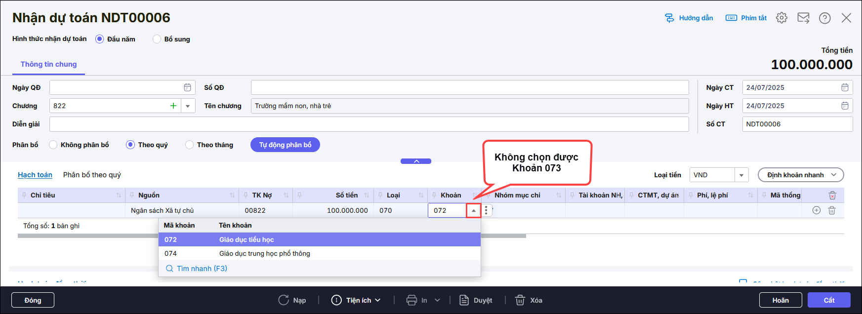 - Ví dụ Trường liên cấp Tiểu học & THCS, nhưng chỉ chọn được Khoản 072, không có Khoản 073.