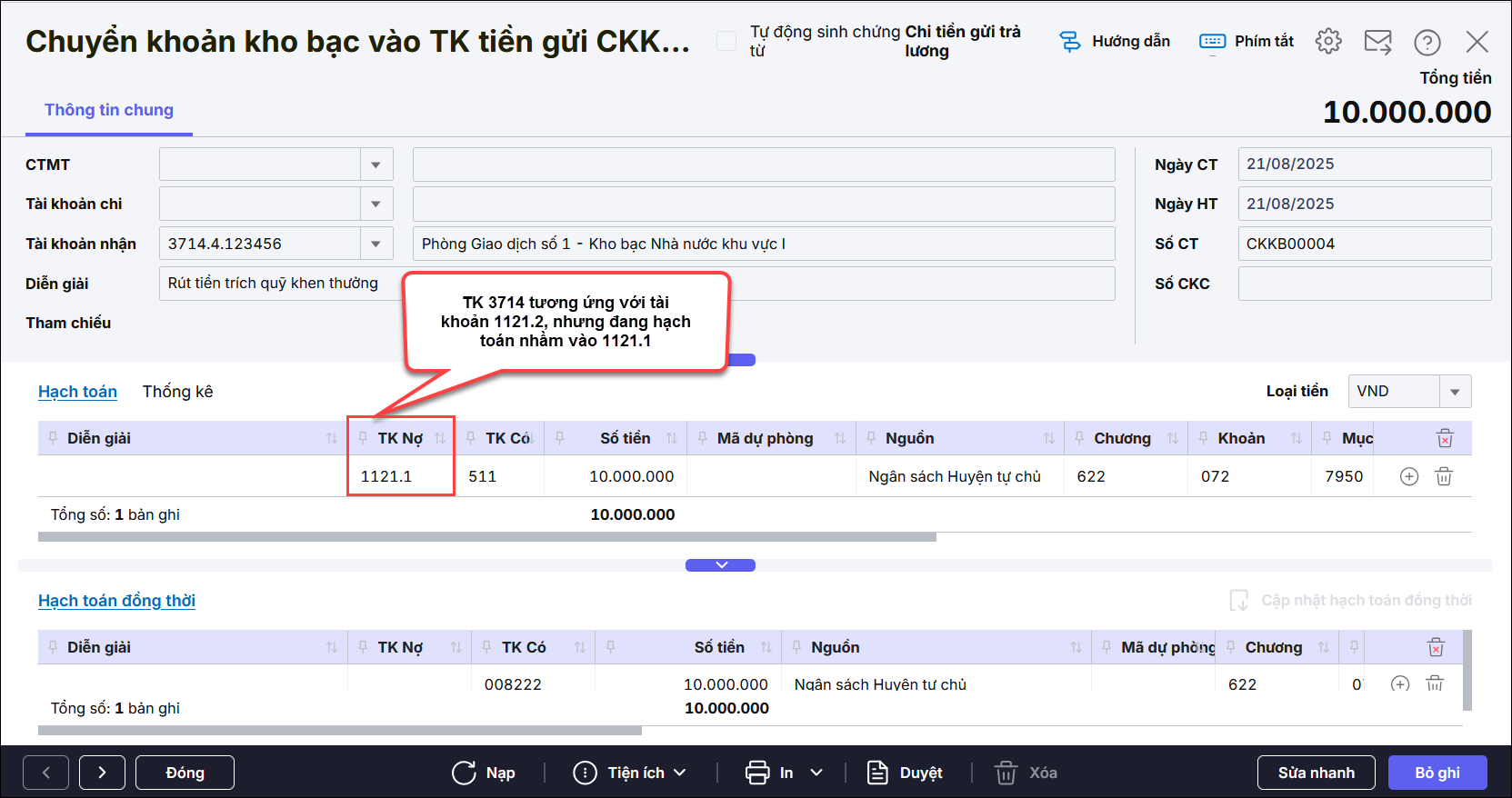 Ví dụ : Tài khoản 1121 tách thành 1121.1, 1121.2……trong đó 1121.2 dùng để theo dõi tài khoản 3714, nhưng khi hạch toán lại chọn nhầm tài khoản 1121.1