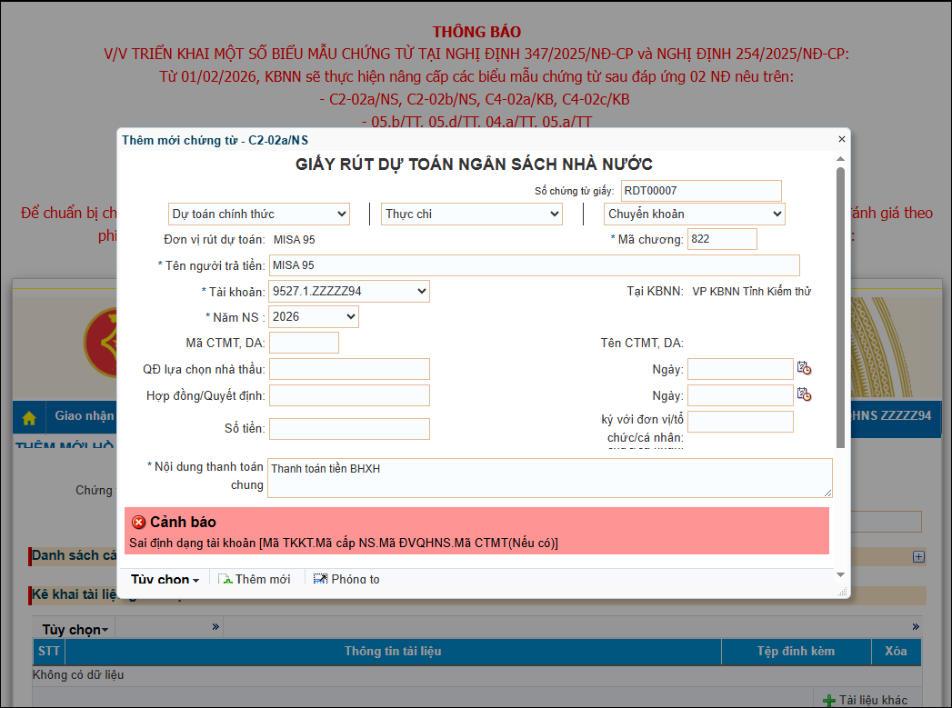 Nếu anh/chị nhập khẩu giấy rút dự toán hoặc ủy nhiệm chi lên DVC gặp cảnh báo “Số tài khoản được phép nhập chữ và số” thì anh/chị cũng xử lý tương tự như cách trên.