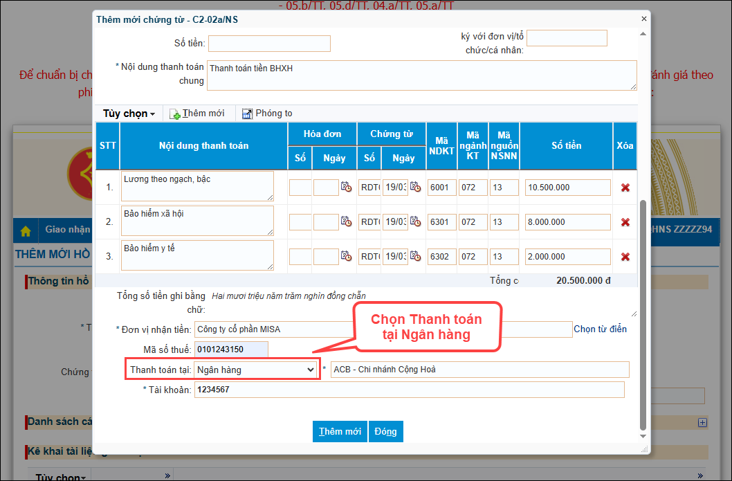 Giải pháp: Trên giao diện thêm mới chứng từ trên DVC, anh/chị cần sửa lại ở mục Thanh toán tại Ngân hàng