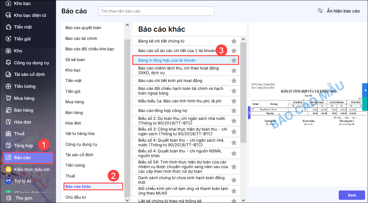 - Vào Báo cáo\Báo cáo khác\Bảng in tổng hợp của tài khoản