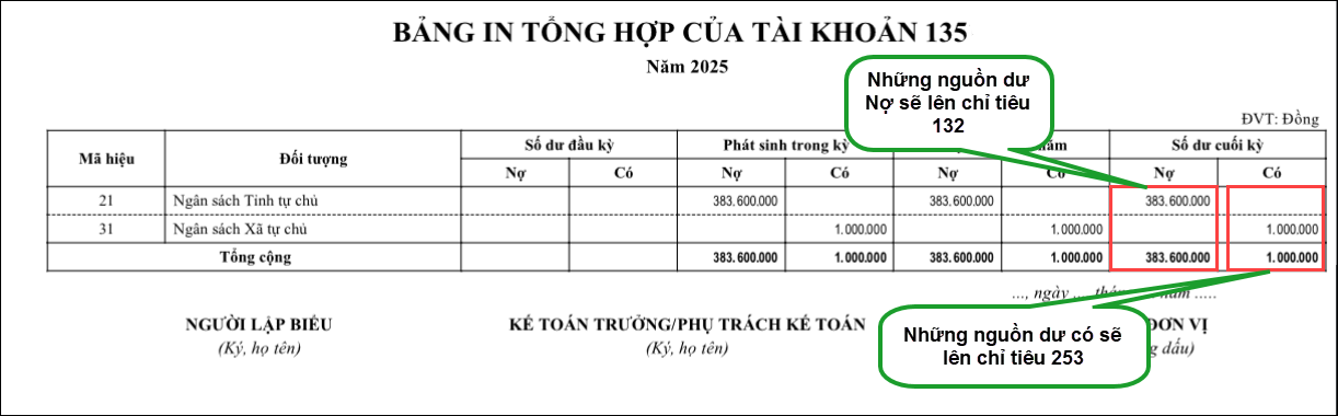 Chỉ tiêu Phải thu kinh phí được cấp (mã số 132) trên báo cáo B01/BCTC: Báo cáo tình hình tài chính sẽ lấy số liệu DNDK_TKNKP TK 135 nghĩa là Dư Nợ Cuối kỳ TK 135 chi tiết theo từng nguồn kinh phí. Nguồn nào Dư Nợ cuối kỳ 135 sẽ lên chỉ tiêu 132, nguồn nào dư có sẽ lên chỉ tiêu Các khoản nhận trước kinh phí được cấp (Mã số 253).