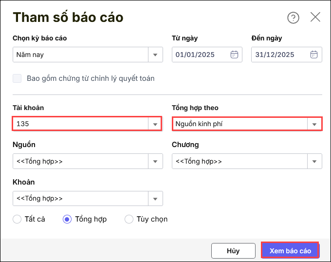 1. Để xem số dư TK 135 chi tiết theo từng nguồn anh/chị thực hiện như sau: