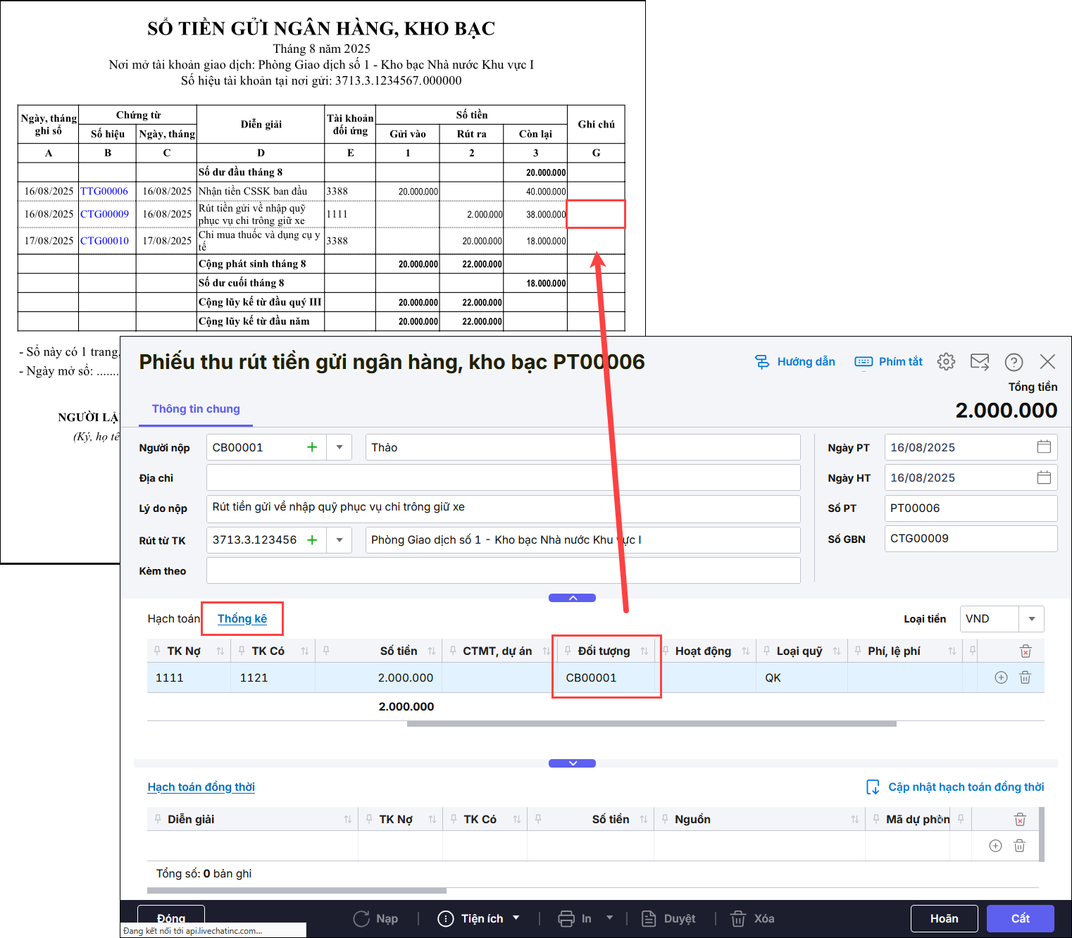 Áp dụng cho trường hợp anh/chị đã nhập liệu ở chứng từ nhưng khi xem báo cáo sổ S12-H: Sổ tiền gửi ngân hàng, kho bạc không lên trường thông tin đối tượng.
