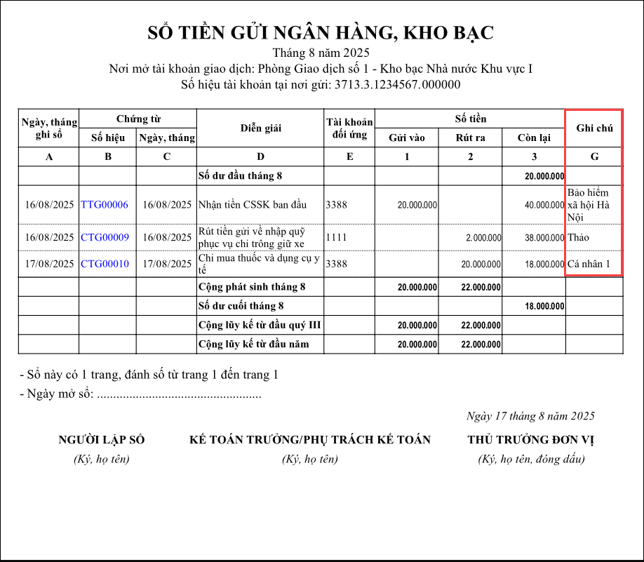 - Khi đó, sổ S12-H: Sổ tiền gửi ngân hàng, kho bạc sẽ hiển thị thông tin đối tượng vào cột Ghi chú trên báo cáo.