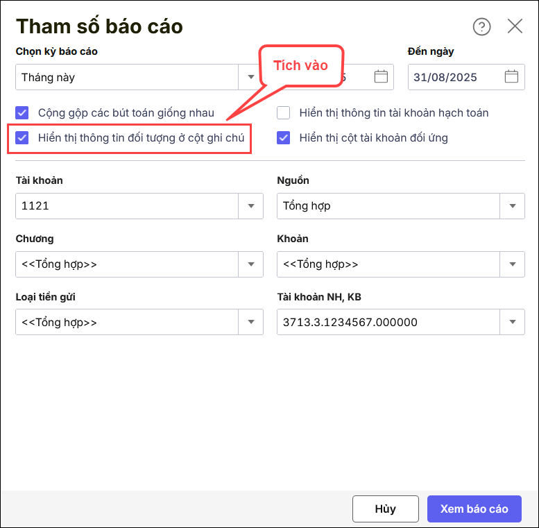 - Khi in sổ S12-H: Sổ tiền gửi ngân hàng, kho bạc, tại phần Tham số báo cáo, tích vào ô Hiển thị thông tin đối tượng ở cột ghi chú.