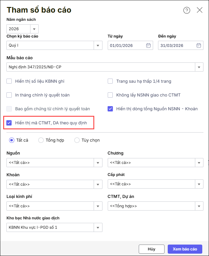 Bước 2: Khai báo tham số in báo cáo, lưu ý tích chọn Hiển thị mã CTMT, DA theo quy định
