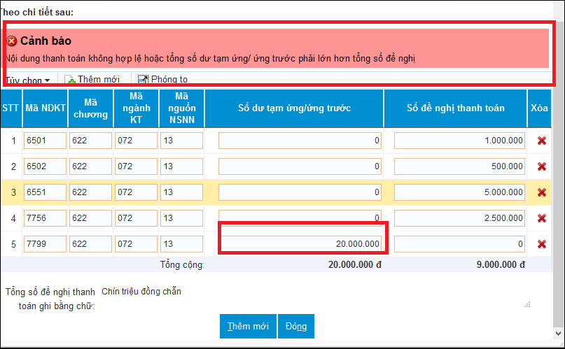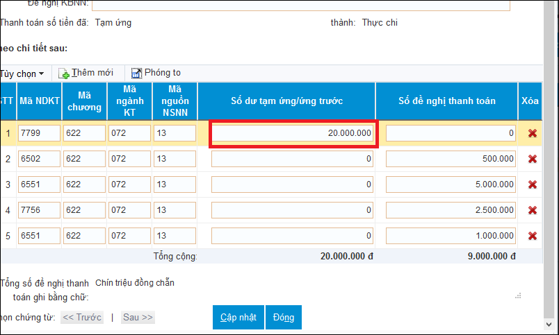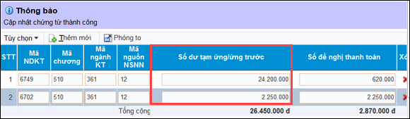 - Theo nguyên tắc trên DVC KBNN: Trường hợp có từ 2 dòng số dư tạm ứng trở lên thì không được có dòng nào tại cột Số dư tạm ứng/ứng trước bằng 0 vì chương trình sẽ không biết lấy số dư tạm ứng từ mục nào nên báo lỗi