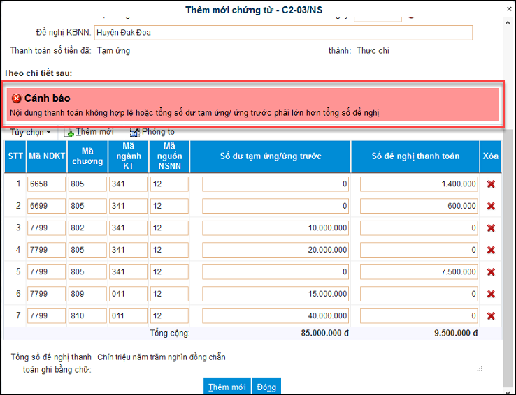 Bài viết này hướng dẫn cách xử lý khi nhập khẩu Mẫu C2-03/NS: Giấy đề nghị thanh toán tạm ứng vào DVC Kho bạc Nhà nước cảnh báo “Nội dung thanh toán không hợp lệ hoặc tổng số dư tạm ứng/ứng trước phải lớn hơn tổng số đề nghị”.