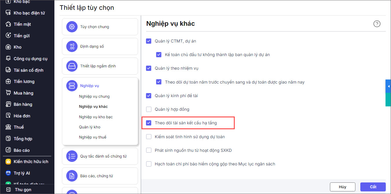 Bước 1: Đơn vị cần tích chọn Theo dõi tài sản kết cấu hạ tầng trong mục Thiết lập\Tùy chọn. Xem hướng dẫn tại đây