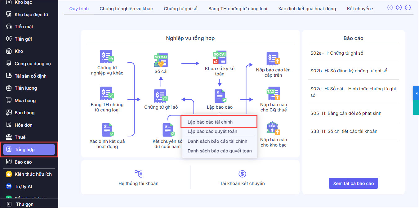 Bước 2: Vào mục Tổng hợp, chọn Lập báo cáo tài chính.