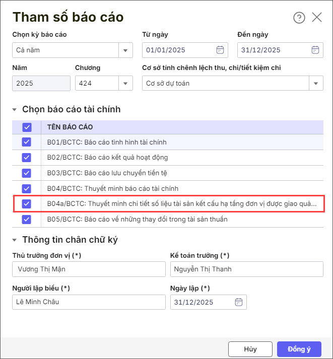 Bước 3: Khai báo tham số lập báo cáo, lưu ý tích chọn báo cáo B04a/BCTC: Thuyết minh chi tiết số liệu tài sản kết cấu hạ tầng đơn vị được giao quản lý nhưng không trực tiếp khai thác sử dụng.