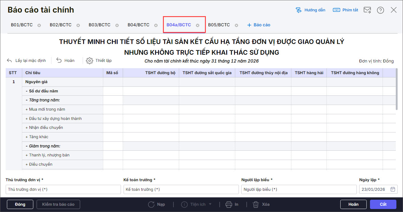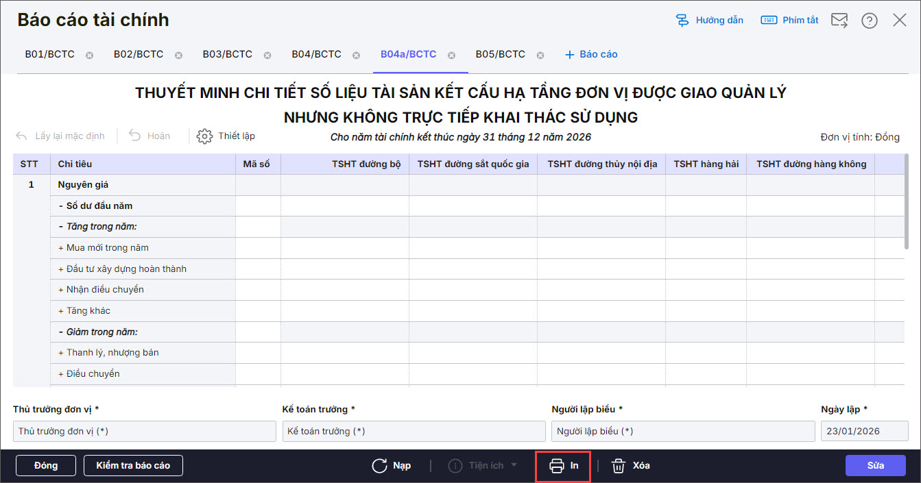 4. Lập B04a/BCTC: Thuyết minh chi tiết số liệu tài sản kết cấu hạ tầng đơn vị được giao quản lý nhưng không trực tiếp khai thác, sử dụng