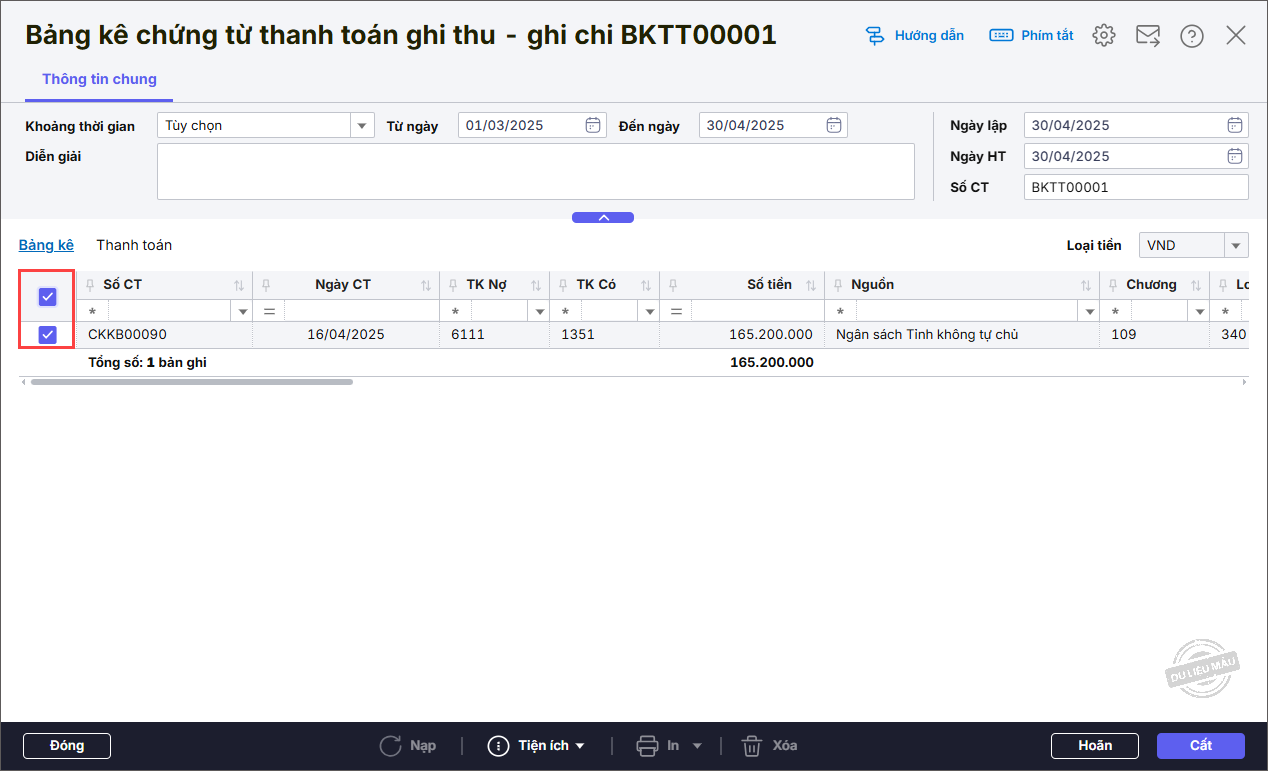 *Lưu ý: để lấy các chứng từ lên bảng kê, anh chị cần chọn cột nghiệp vụ trên chứng từ là Ghi thu – Ghi chi.
