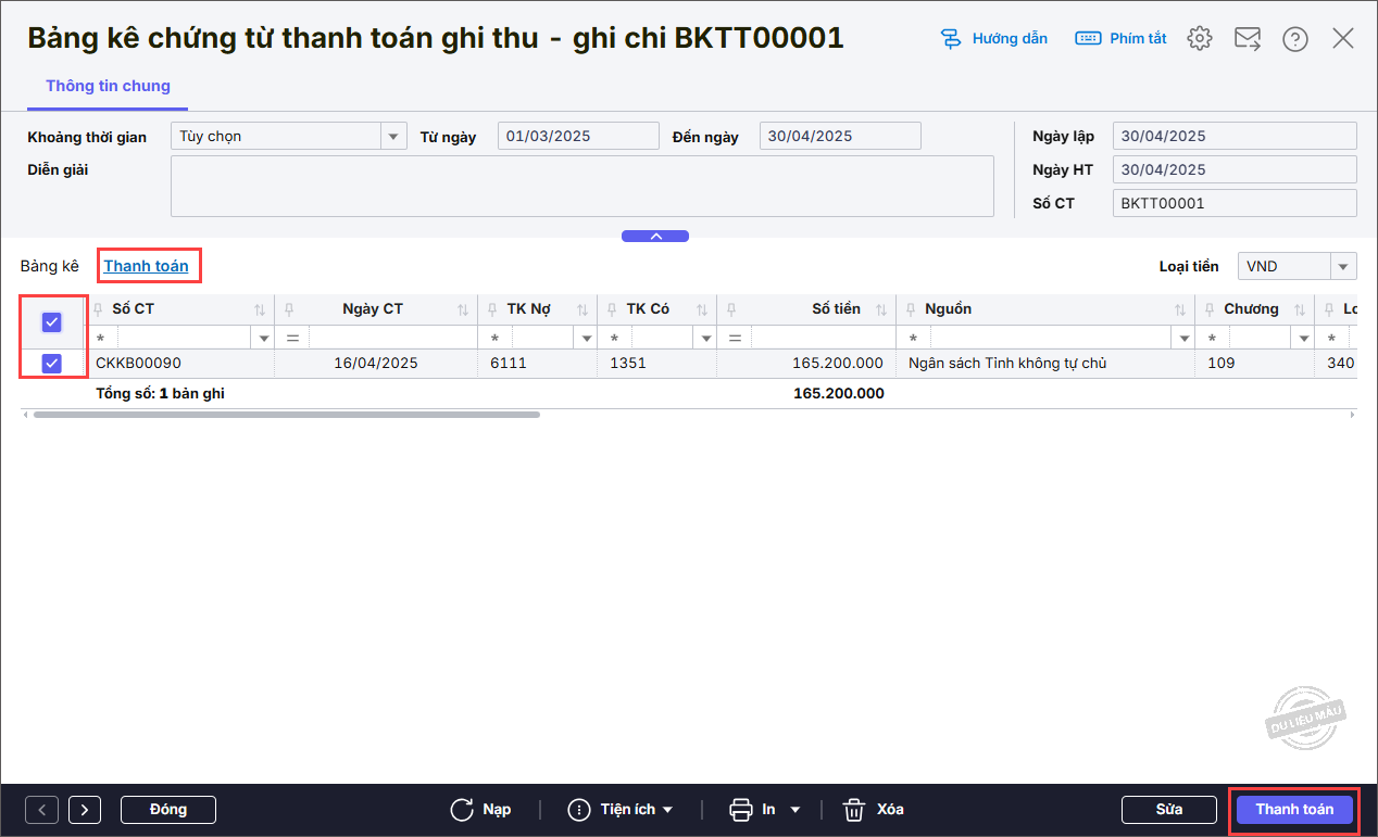 - Tích chọn các chứng từ đã được kho bạc chấp nhận thanh toán. Lưu ý: phải tích chọn ít nhất 1 chứng từ.