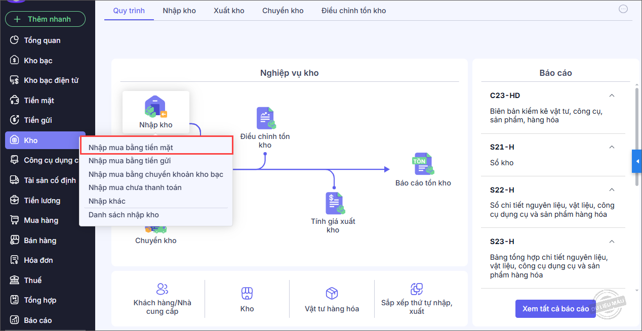 - Chọn hình thức mua nhập kho. Ví dụ nhập mua bằng tiền mặt.