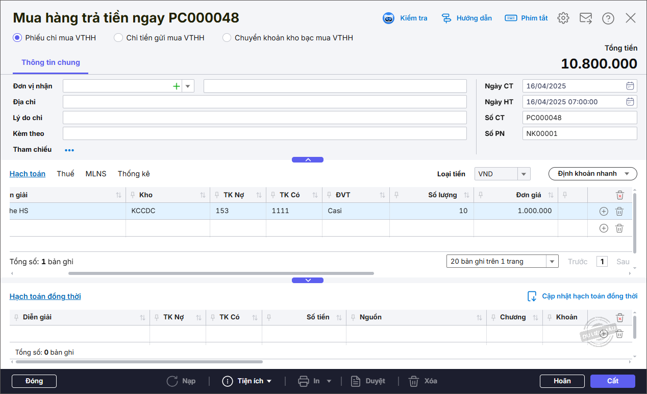Bước 1: Ngày 16/04/2025, đơn vị mua nhập kho bằng tiền mặt 10 bộ bàn ghế, đơn giá: 1.000.000 đồng/bộ, thuế suất 8%.