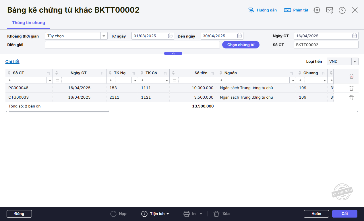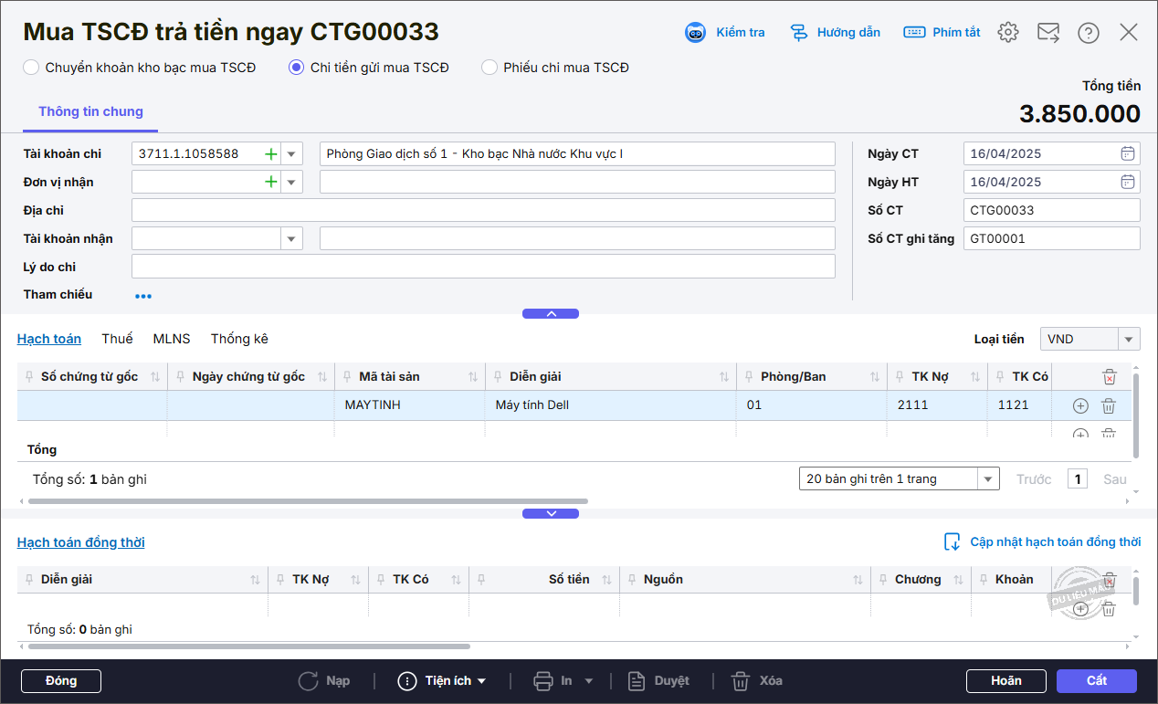 Bước 2: Ngày 16/04/2025, đơn vị mua chuyển khoản ngân hàng mua 1 chiếc máy in, đơn giá: 3.000.000 đồng/chiếc, thuế suất 10%.