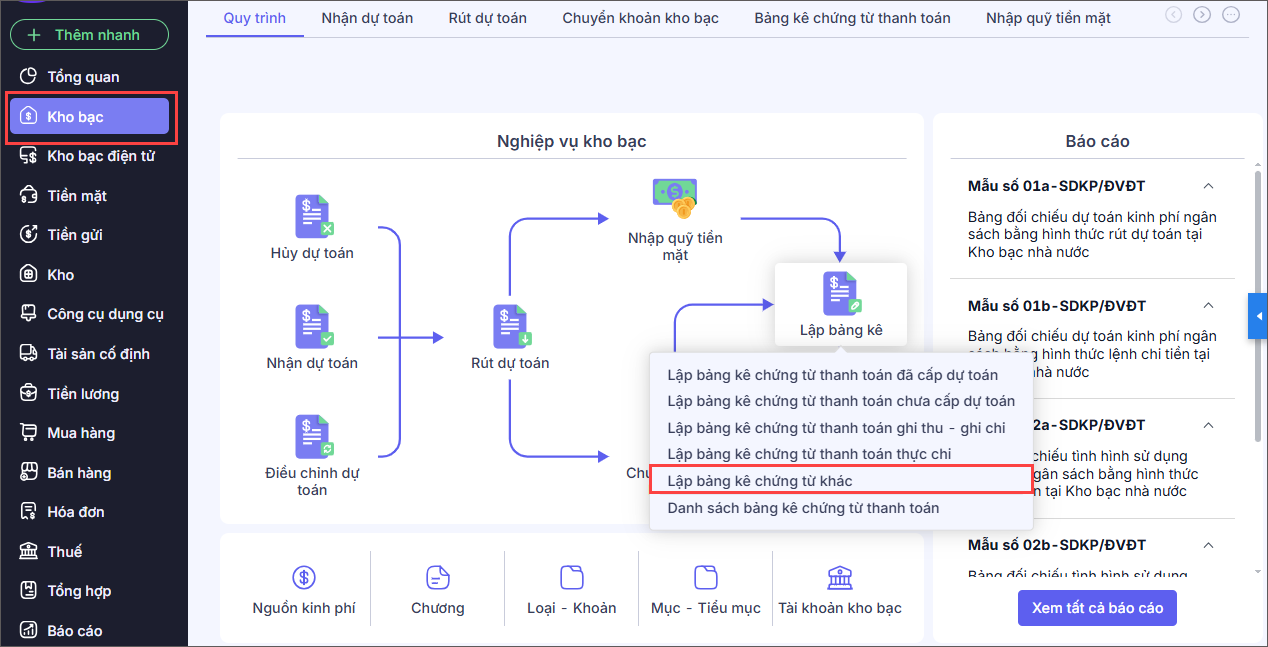 Bước 1: Vào phân hệ Kho bạc\Lập bảng kê\Lập bảng kê chứng từ khác.