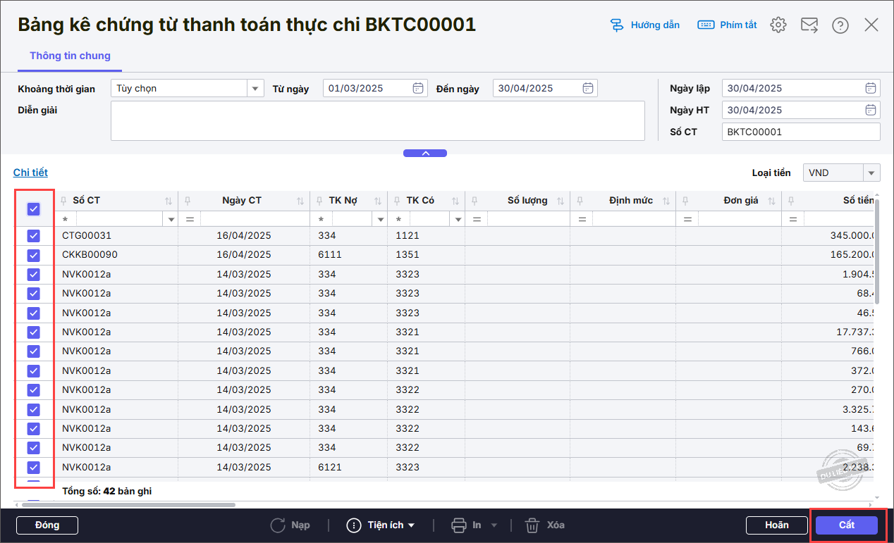 Bước 2: Chọn Khoảng thời gian cần lập bảng kê những chứng từ thực chi.