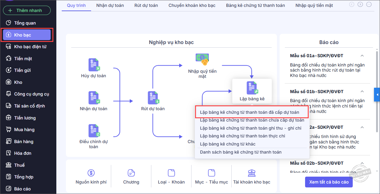 Bước 1: Vào phân hệ Kho bạc, chọn Lập bảng kê\Bảng kê chứng từ đã cấp dự toán.