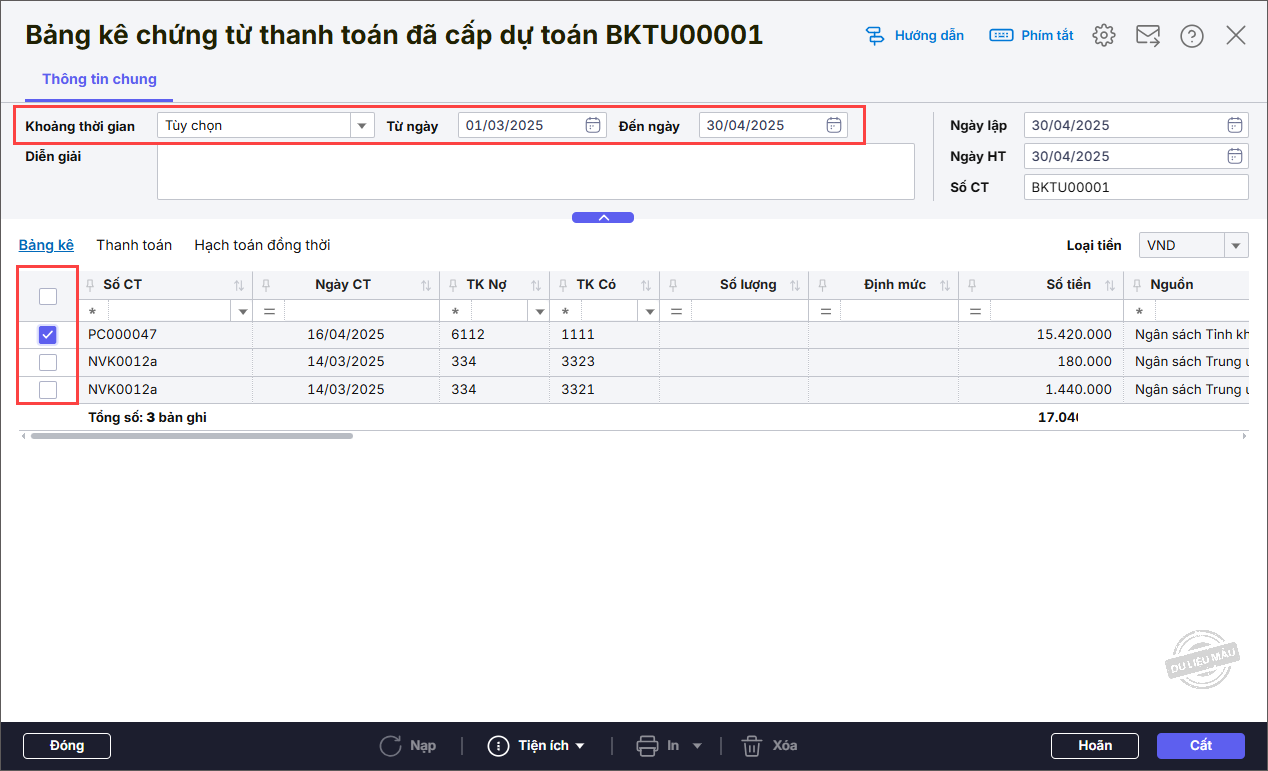 Bước 2: Chọn Khoảng thời gian cần lập bảng kê những chứng từ chi tạm ứng.