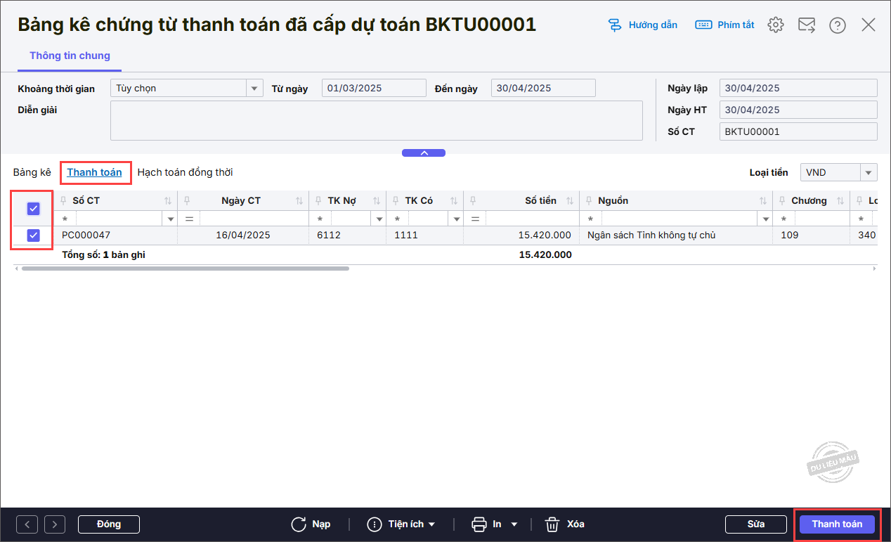 - Nhấn Thanh toán trên thanh công cụ.