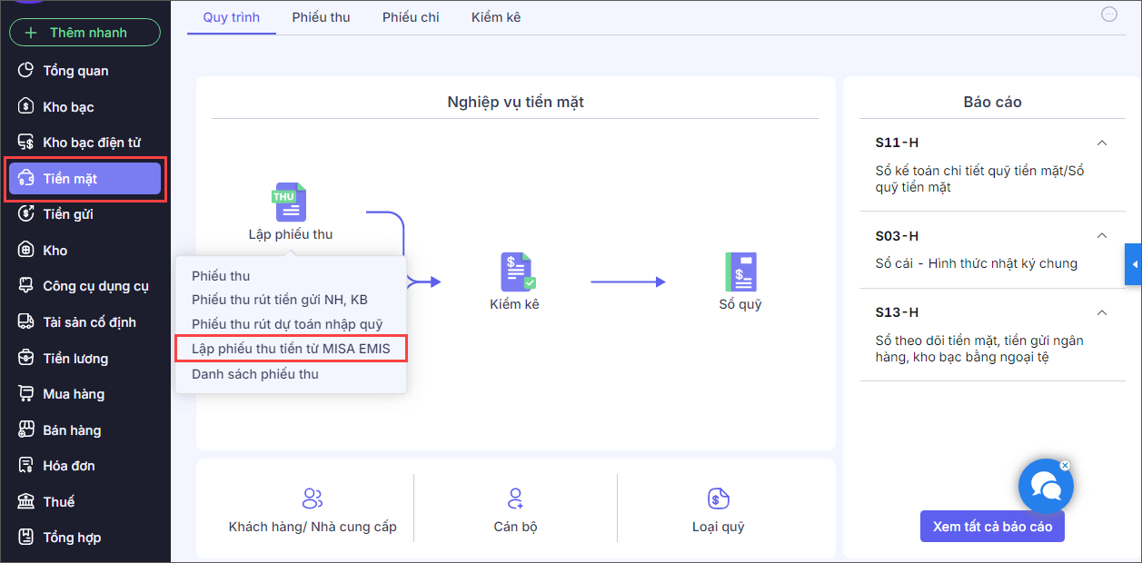 Bước 2: Lập phiếu thu tiền mặt từ MISA EMIS