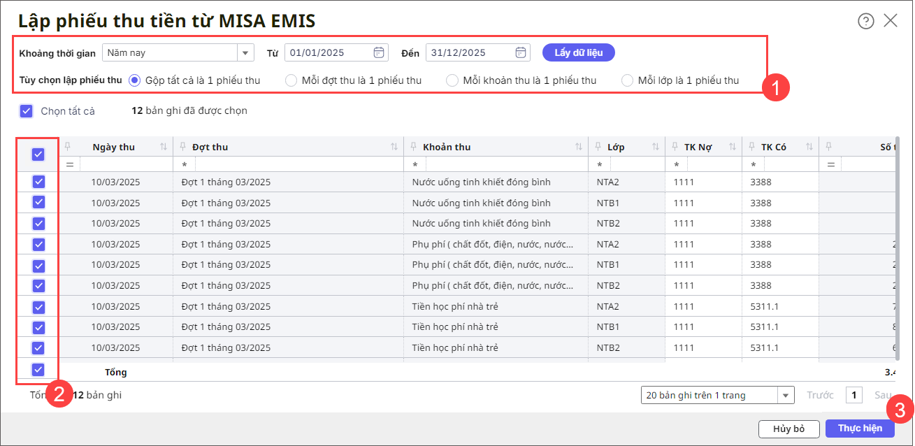 *Lưu ý: Trường hợp kế toán đã lấy phiếu thu từ MISA EMIS về MISA Mimosa Online, sau đó thực hiện chỉnh sửa lại thông tin đợt thu trên MISA EMIS thì cần phải xoá phiếu thu trên Mimosa và thực hiện lấy lại dữ liệu.