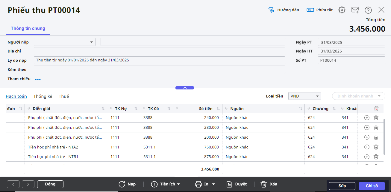 – Tài khoản Có được mặc định dựa trên tính chất Khoản thu đã được khai báo trong EMIS khoản thu\Lập kế hoạch thu\Danh sách khoản thu. Anh/chị có thể sửa lại TK Nợ, TK Có tương ứng.