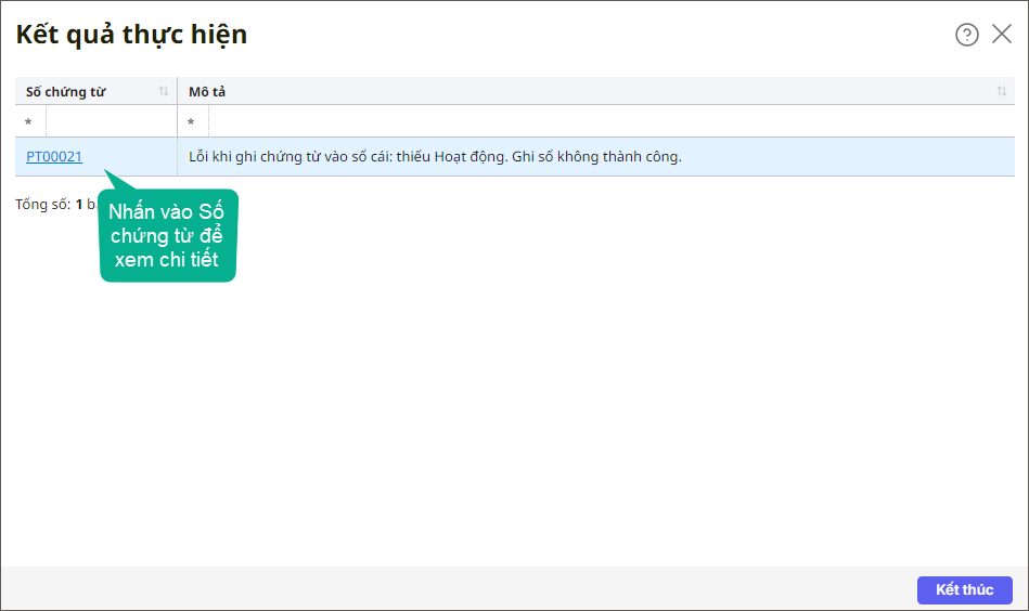 4. Phần mềm thông báo Kết quả thực hiện. Chọn vào Số chứng từ để xem chi tiết phiếu thu.