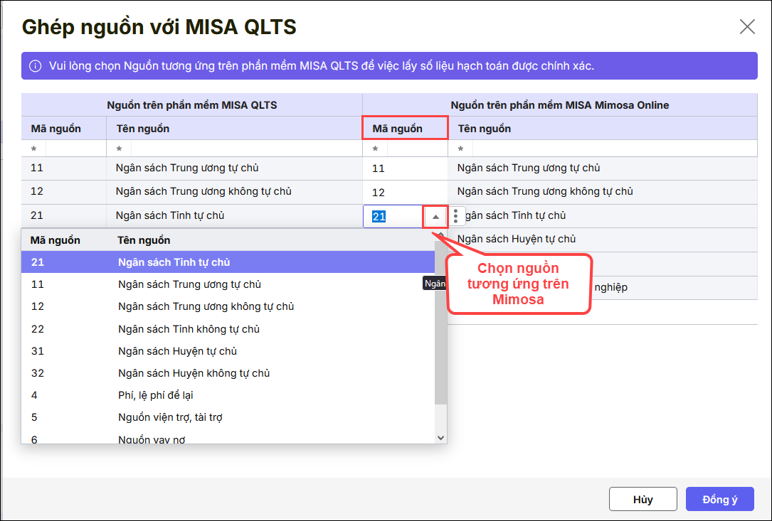 - Tại cột mã nguồn trên phần mềm MISA Mimosa Online: chọn Nguồn tương ứng trên danh sách
