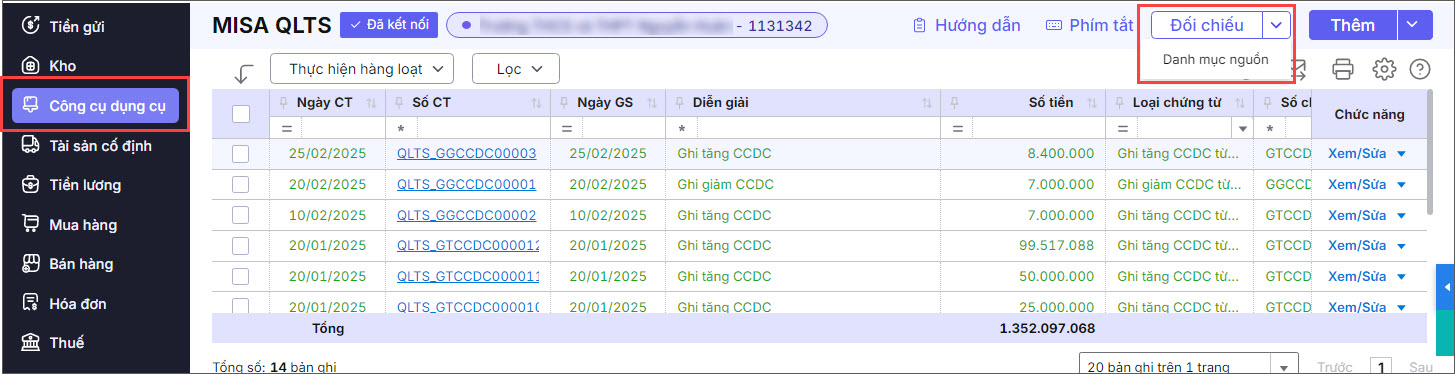 - Vào phân hệ Công cụ dụng cụ, nhấn Đối chiếu\Danh mục nguồn.