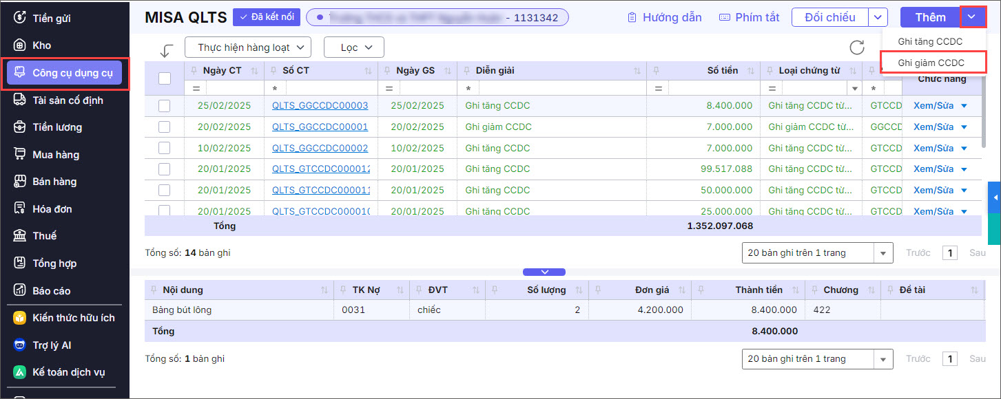 - Vào Công cụ dụng cụ, nhấn vào biểu tượng mũi tên cạnh chữ Thêm\Ghi giảm CCDC.