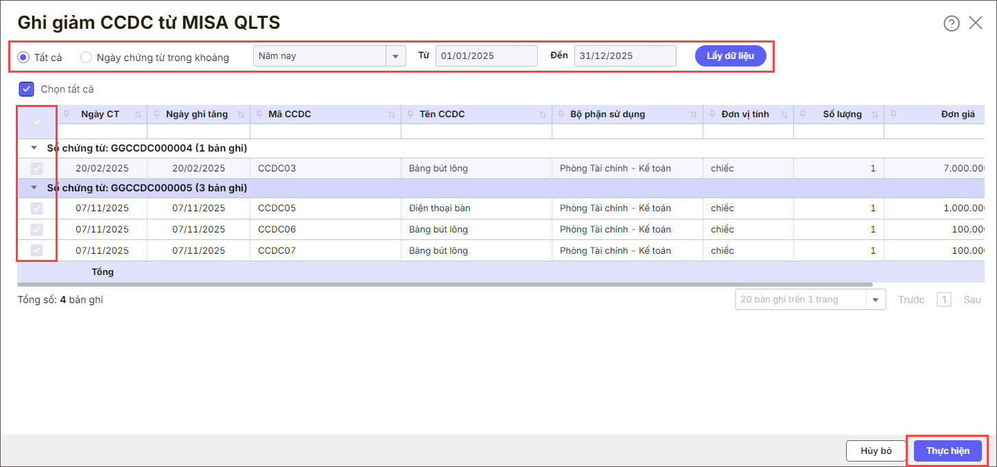 Bước 3: Lấy chứng từ ghi giảm CCDC từ MISA QLTS sang Mimosa Online